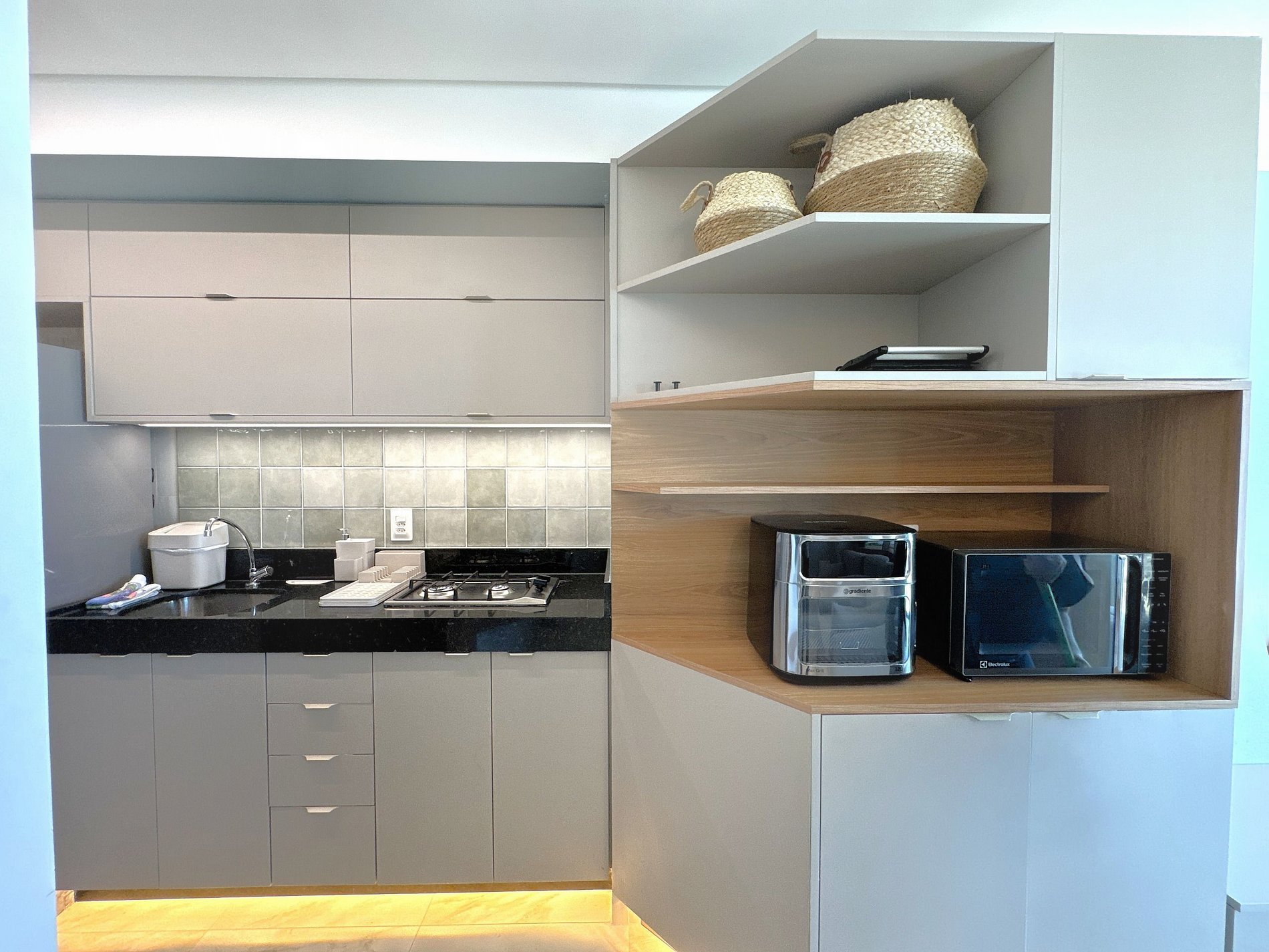 Cozinha completa: A cozinha é equipada com eletrodomésticos modernos, como fogão, micro-ondas, geladeira e utensílios essenciais para preparar refeições.