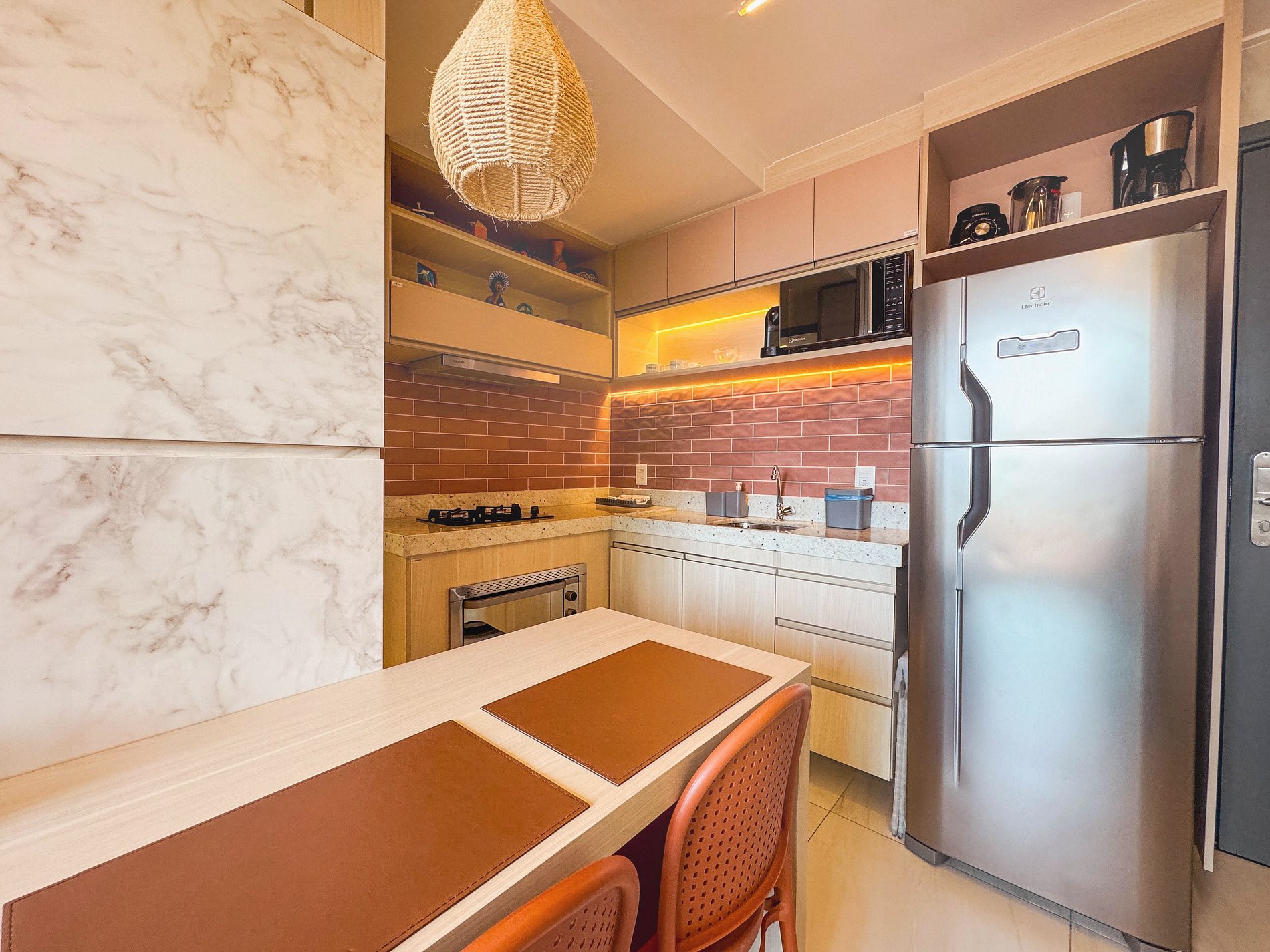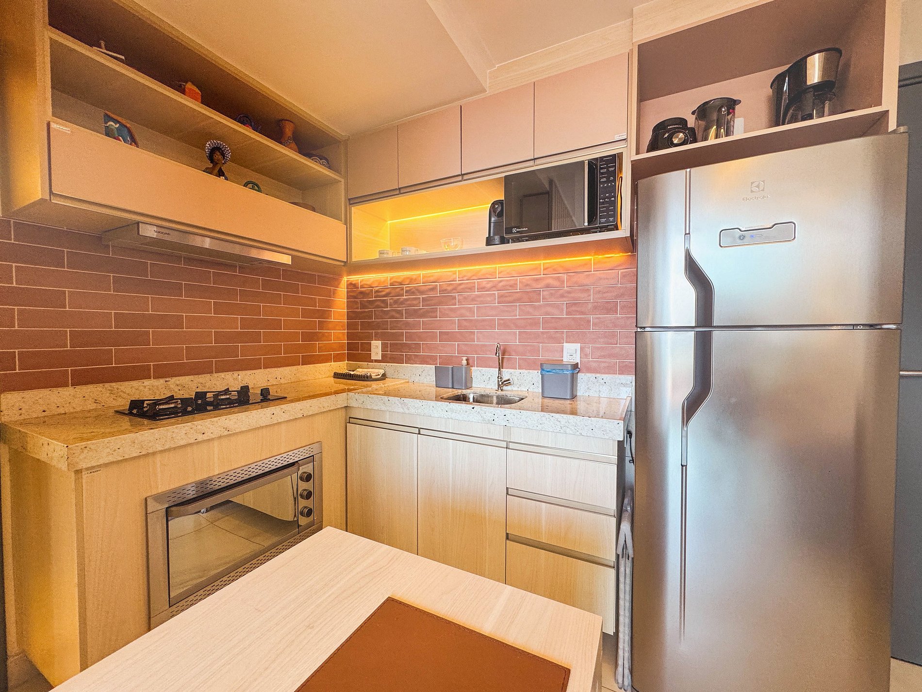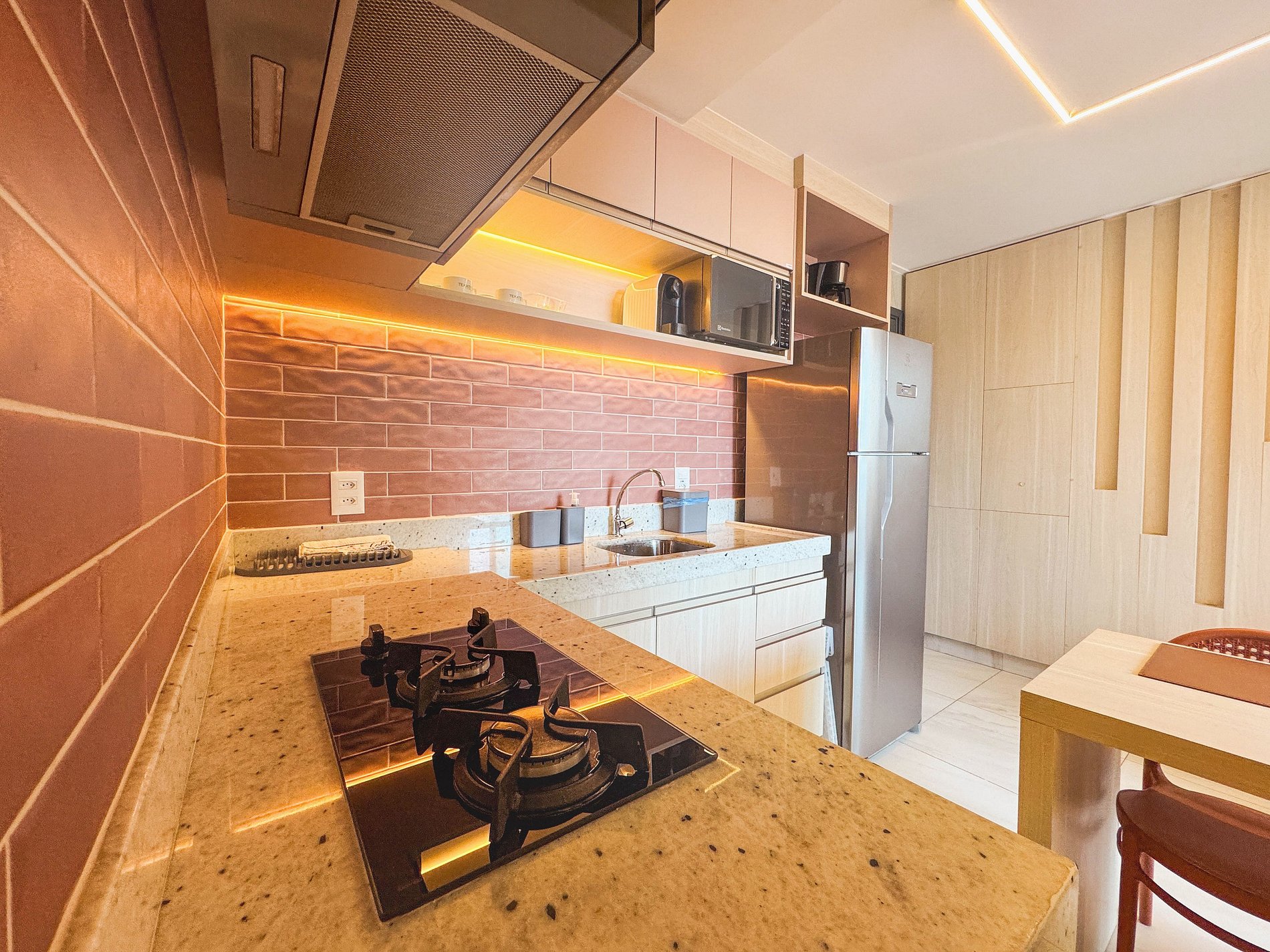 Cozinha completa: A cozinha é equipada com eletrodomésticos modernos, como fogão, micro-ondas, geladeira e utensílios essenciais para preparar refeições.